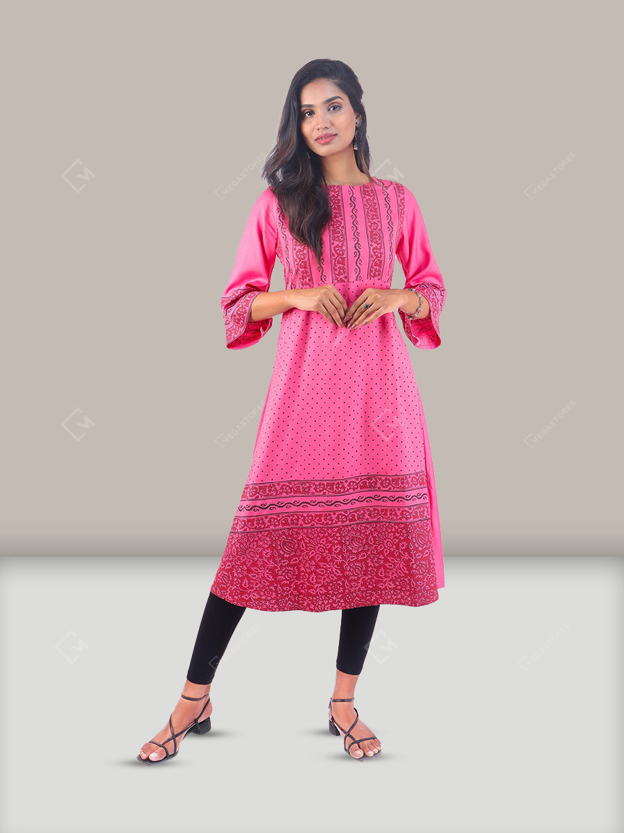 Hand block print pure cotton pink Kurti with round neck and bell sleeve is a must buy for festive occasions. The touch of hand block print with Rasgulla fabric, adds richness to the whole attire. Size: L