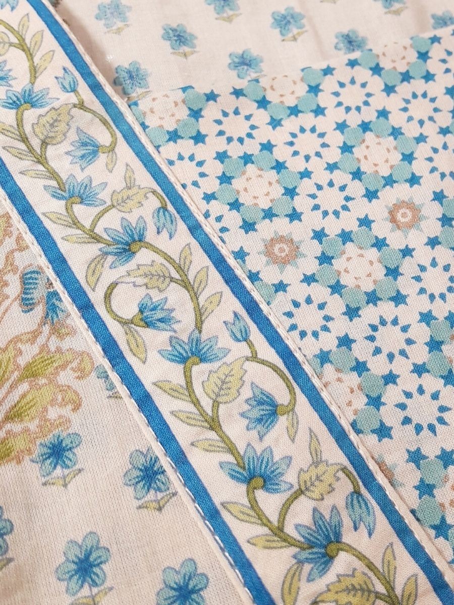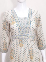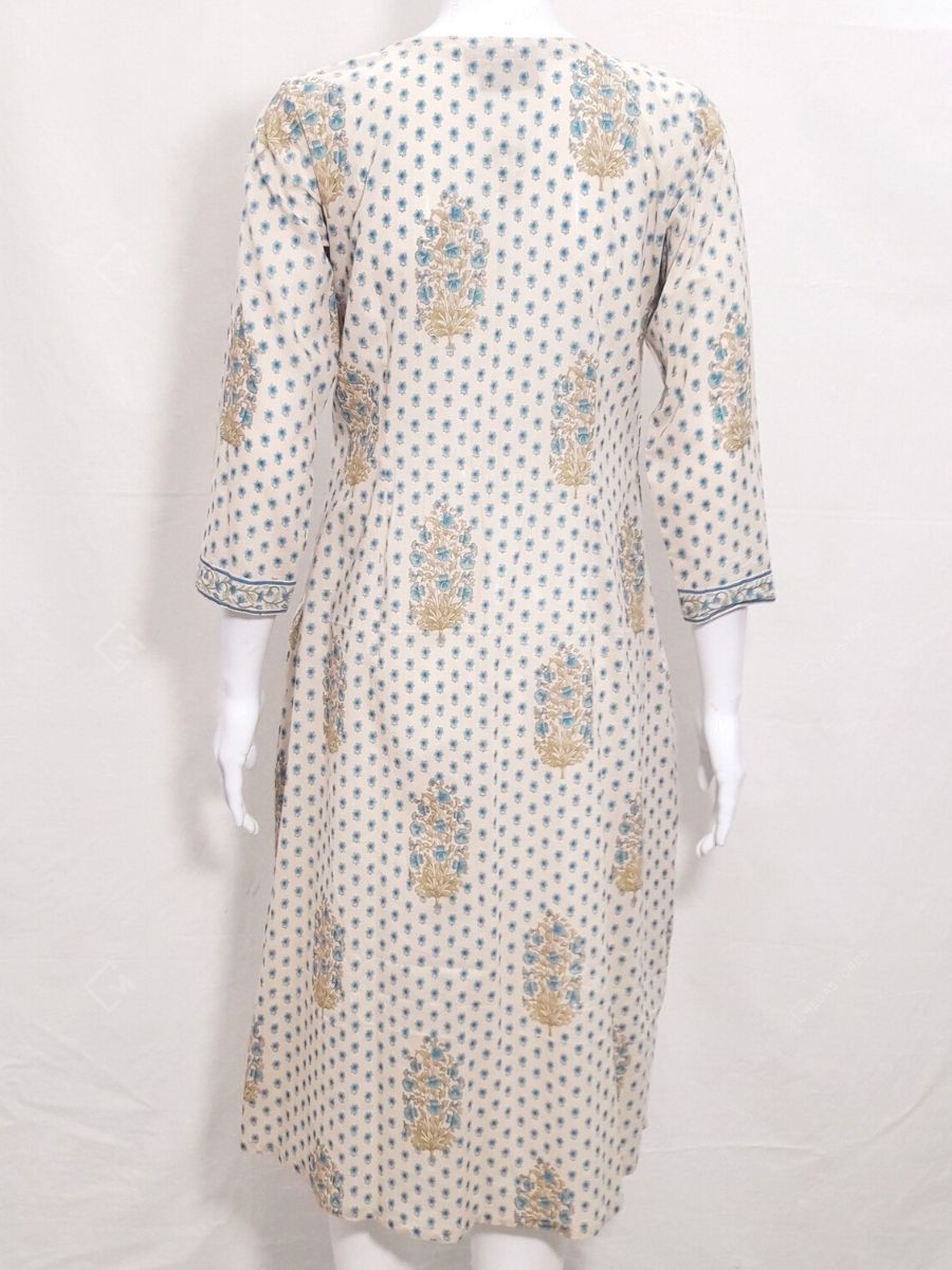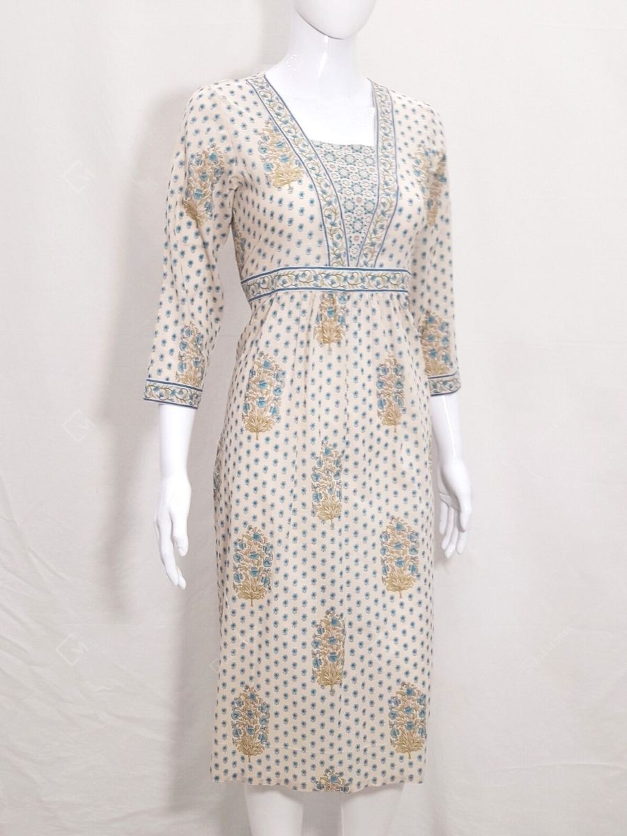 This white-colored naturally dyed hand block printed kurti with elegant blue floral design handcrafted on cotton fabric is a must by as casual wear. This long kurti renders an ethnic look and can be styled with a variety of Indian as well as western bottoms.