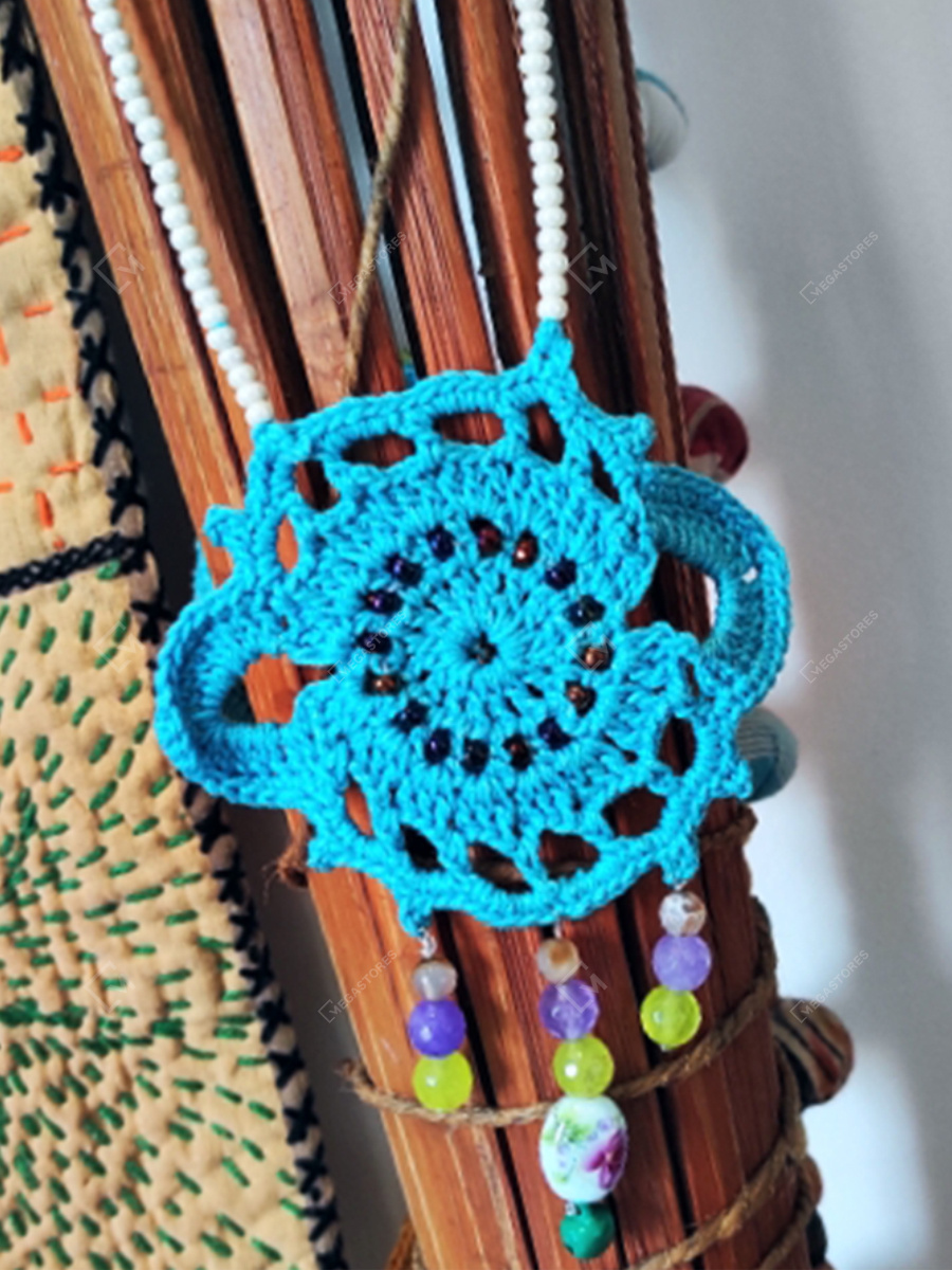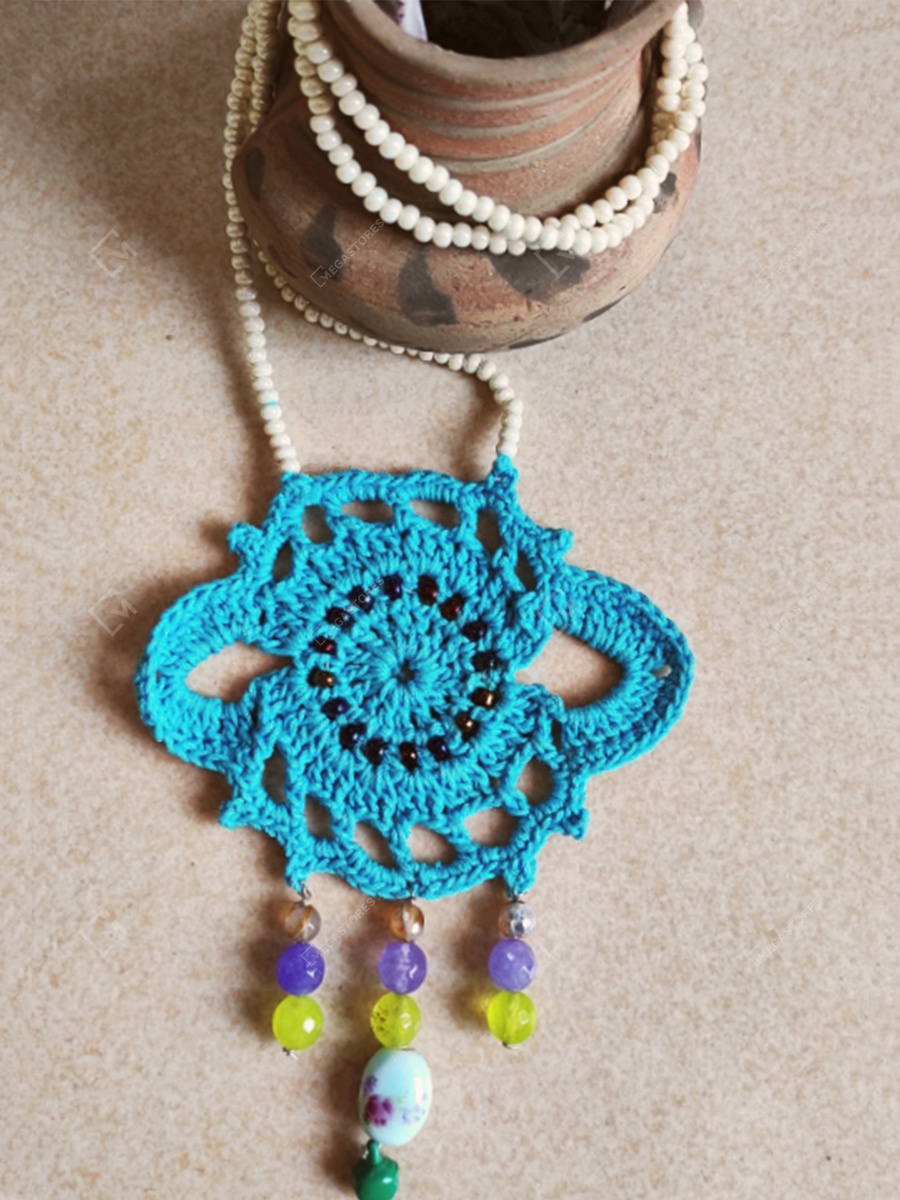 This elegant sky blue crochet pendant necklace with wooden beads beautifully handcrafted by craftswomen renders a very contemporary look. This piece of accessory can be styled easily with western as well as Indian outfits.