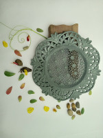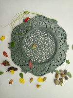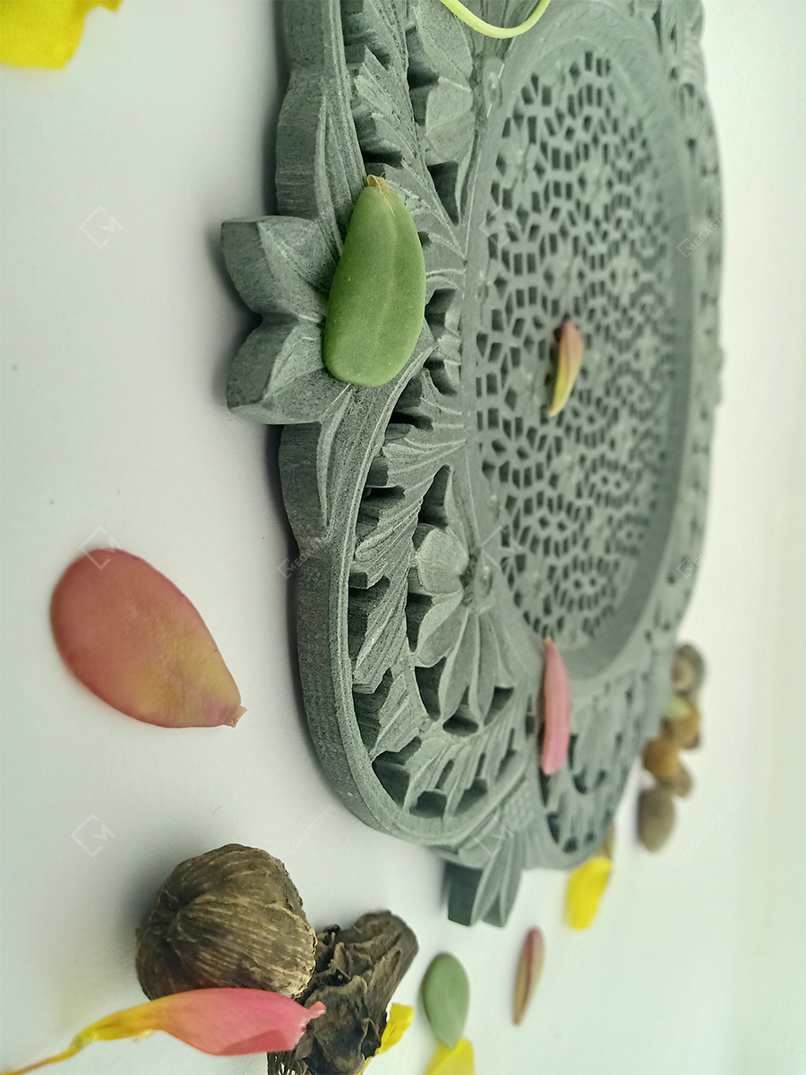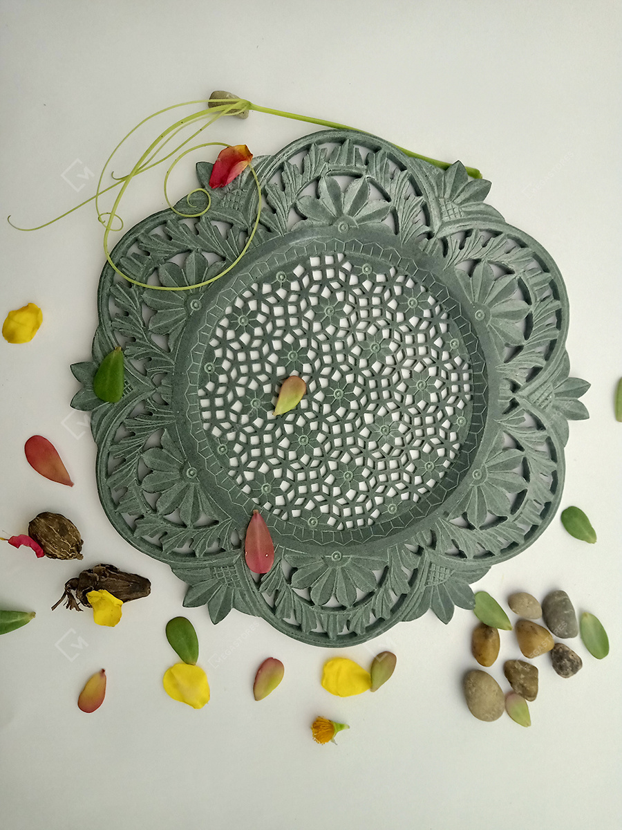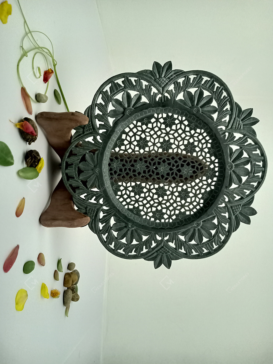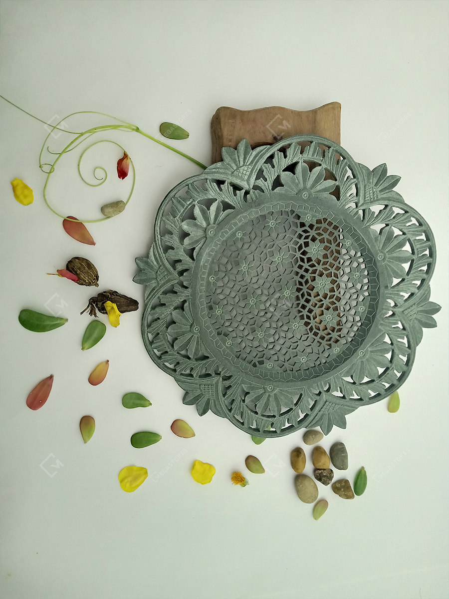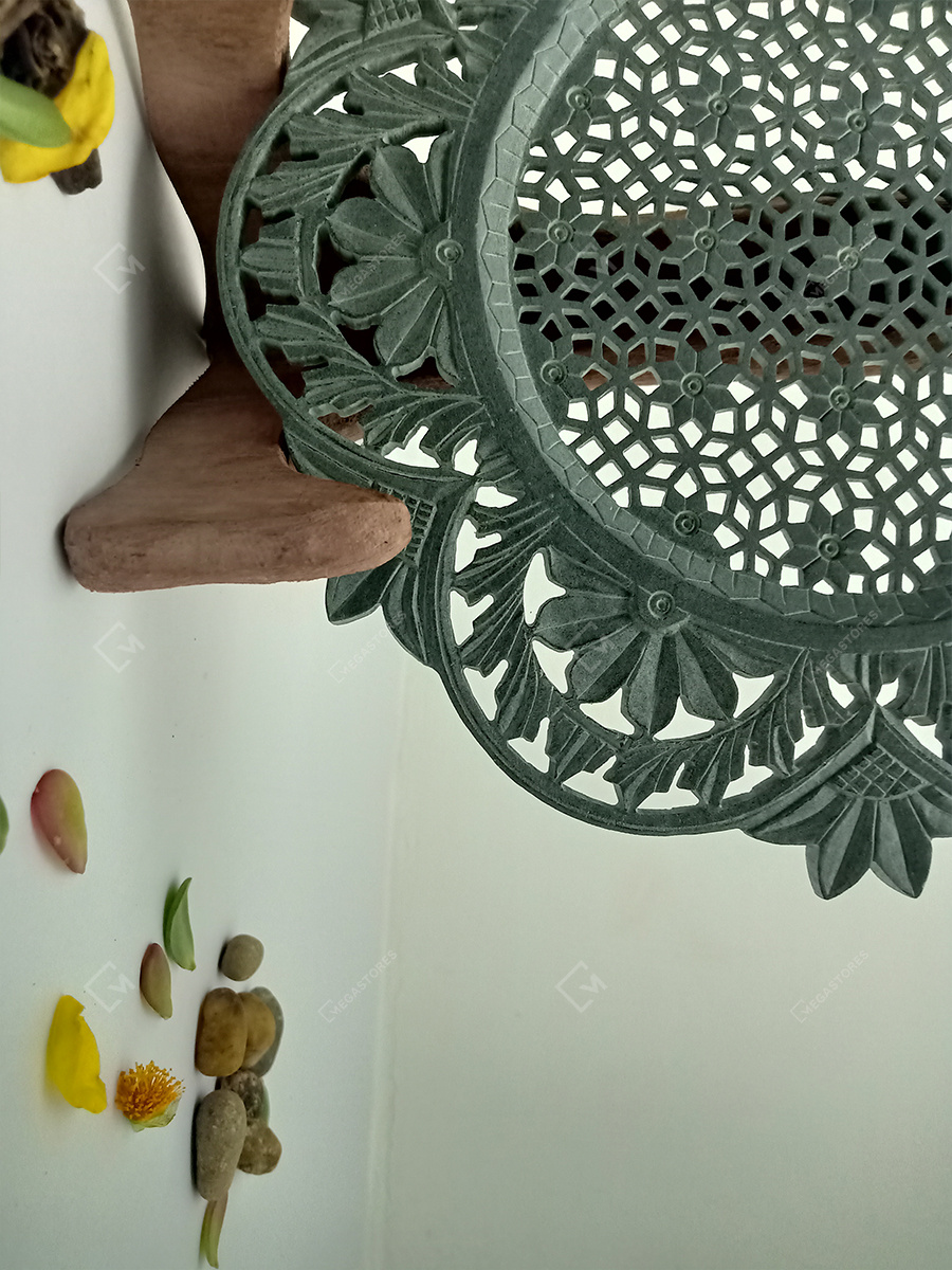 This stunning decor plate is a combination of shadow grey and extensive detailing and is a delight to the eyes. The profound octagonal lattice-work in the middle surrounded with flower-shaped natural manovat work provides a vintage yet ethnic look to the walls. It is a product of skillful craftsmanship.