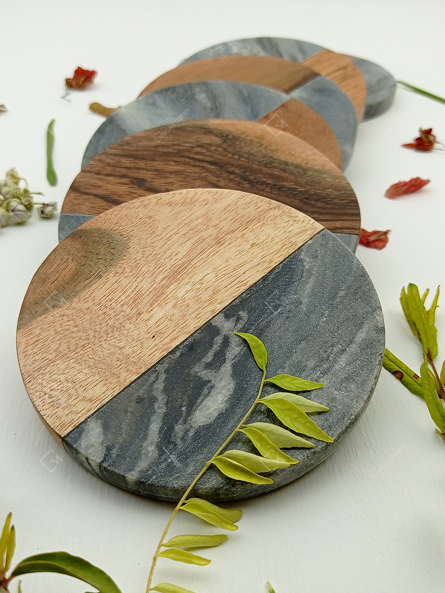 Home Kitchen & Dining Coasters Marble & Wood Handcrafted Set of 4 Coasters Uzma by Al Maun