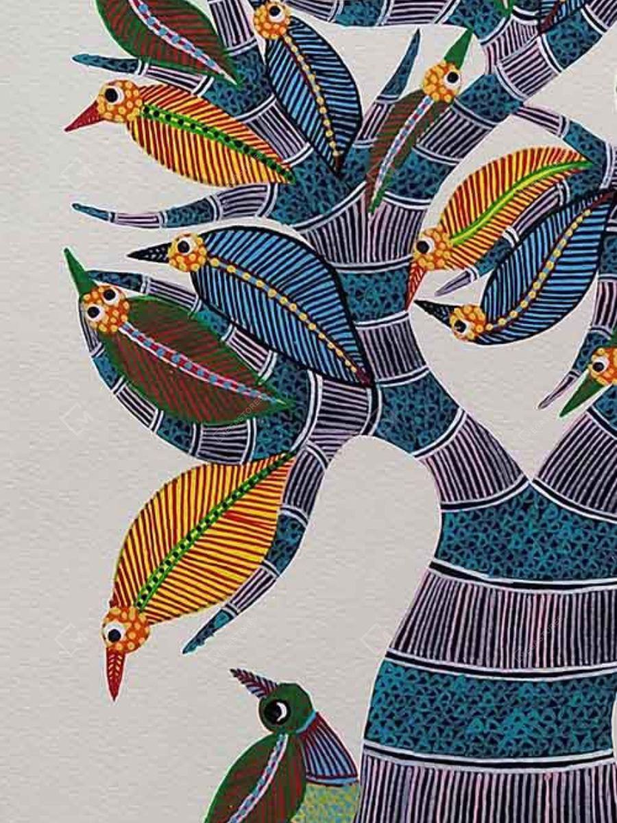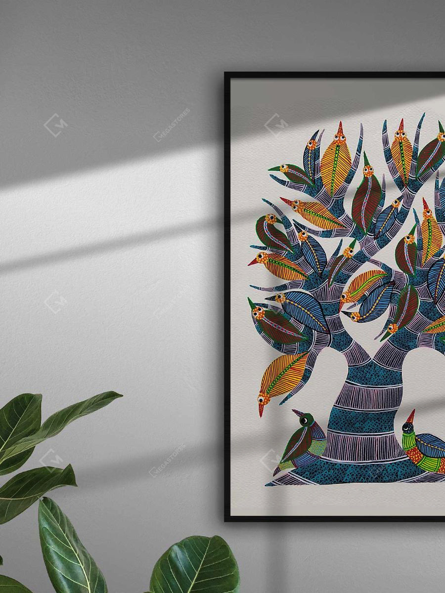 This hand-painted Gond art painting depicts an intricately designed colorful birds A3 canvas. It is a must have piece of wall art to impart ethnic vibes to your home decor.