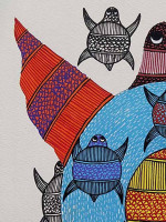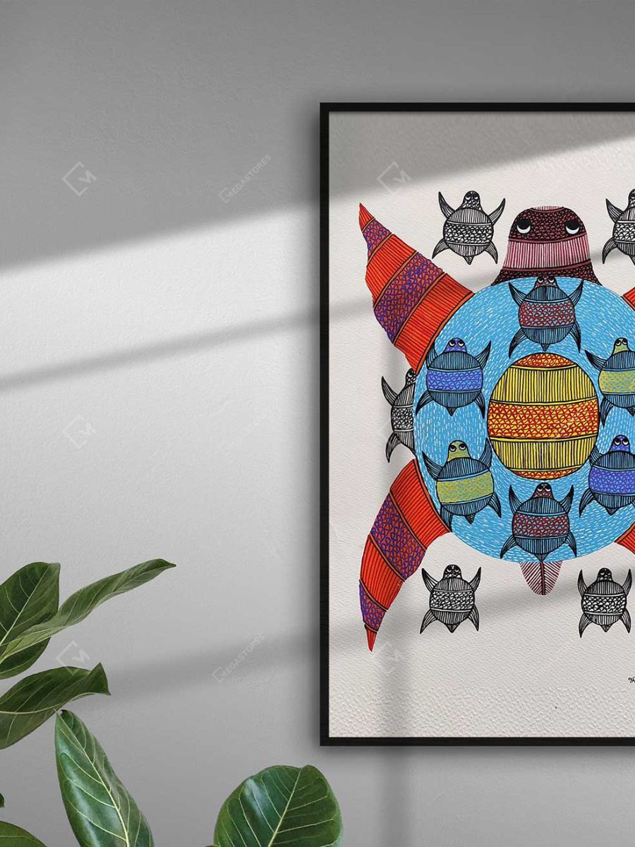 This hand-painted Gond art painting depicts an intricately designed multicolor tortoise on A4 paper. It is a must have piece of wall art to impart ethnic vibes to your home decor.