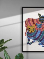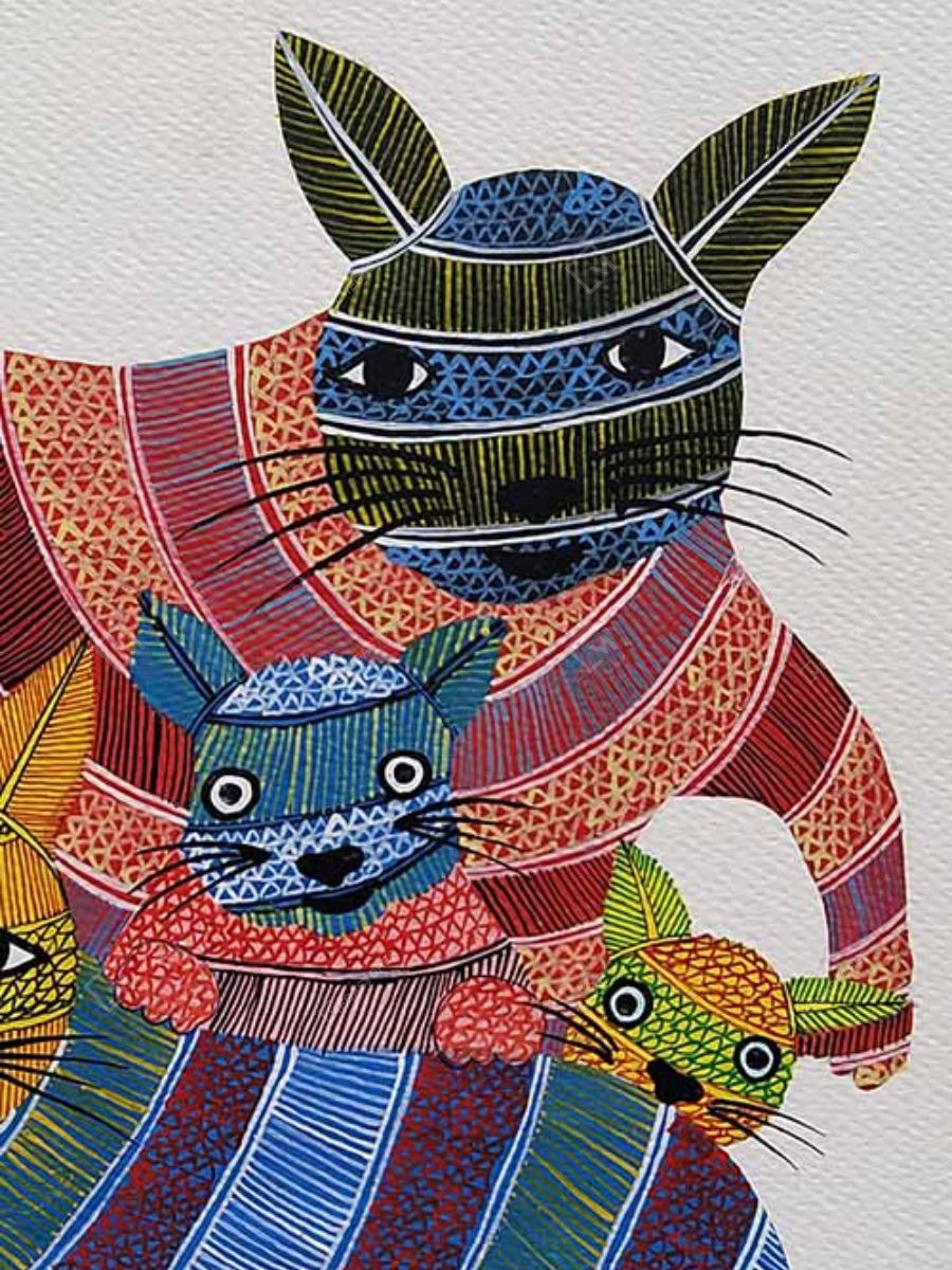 This hand-painted Gond art painting depicts an intricately designed cat family A3 canvas. It is a must have piece of wall art to impart ethnic vibes to your home decor.