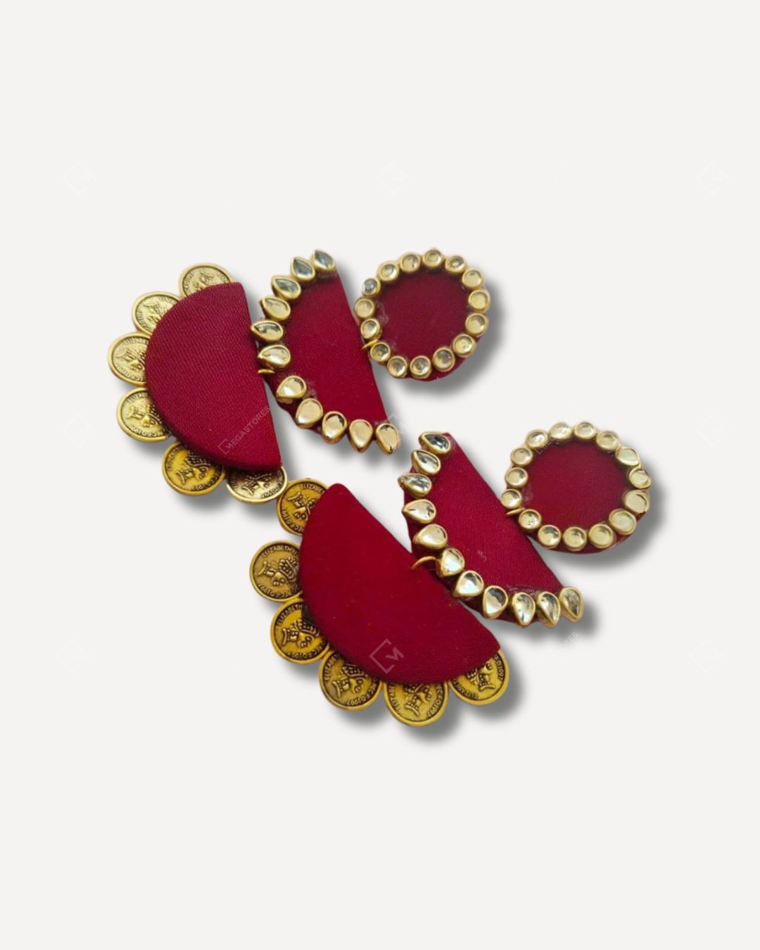 Rainvas introduces stunning Red Maroon Kundan Jhumka Earrings adorned with Golden Coins. Handcrafted to perfection, these earrings blend traditional elegance with a touch of opulence, perfect for festive occasions.• Back finding - Friction back