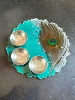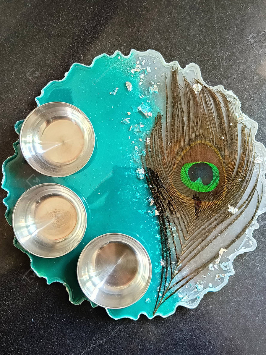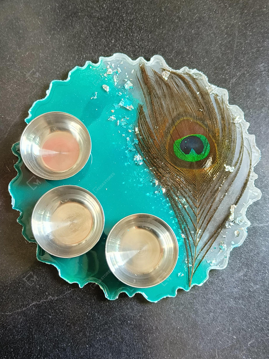 Resin art Sea Green 8 x 8 inches Pooja Thali with Peacock Feather is elegantly handcrafted. This thali is a must buy buy piece of art if you are looking for a gift for someone.