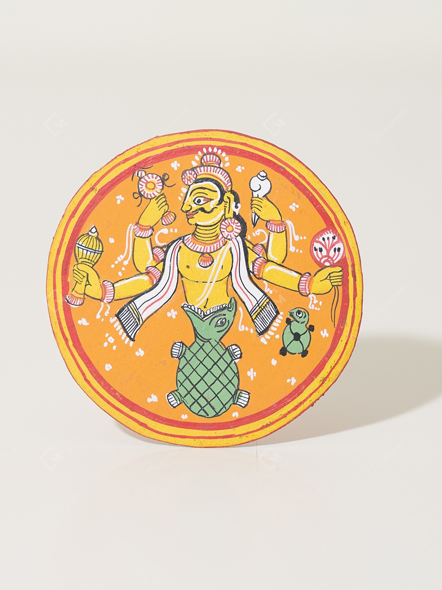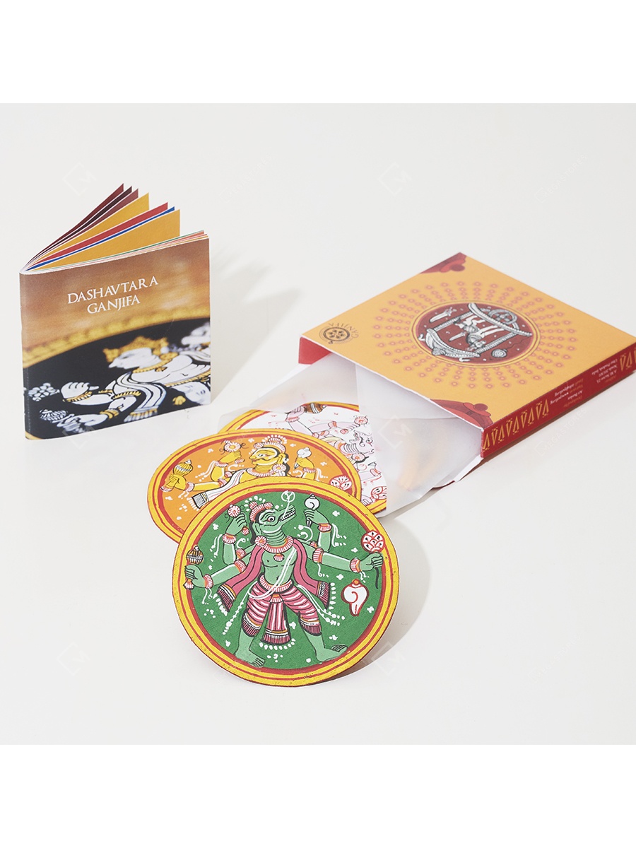About Craft -This exclusive set of Dashavtar Ganjifa is painted in Pattachitra style of Odisha. Each card has been carefully hand crafted and hand painted by the Chitrakaars (skilled artists) of Odisha. Each card has been made through an intricate and long process using old cotton saris , and then painted delicately using squirrel hair brushes and crushed stone colours.