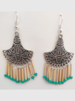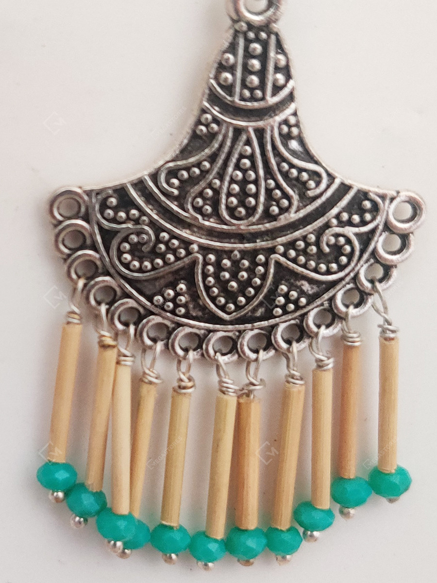 This pair of handmade german silver bell shaped latkan earrings is crafted out of bamboo by craftswomen of Dangs district, Gujarat. The combination of turquoise beads imparts a very ethnic look. This sustainable piece of accessory can be easily styled with a variety of wardrobes.