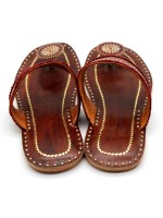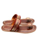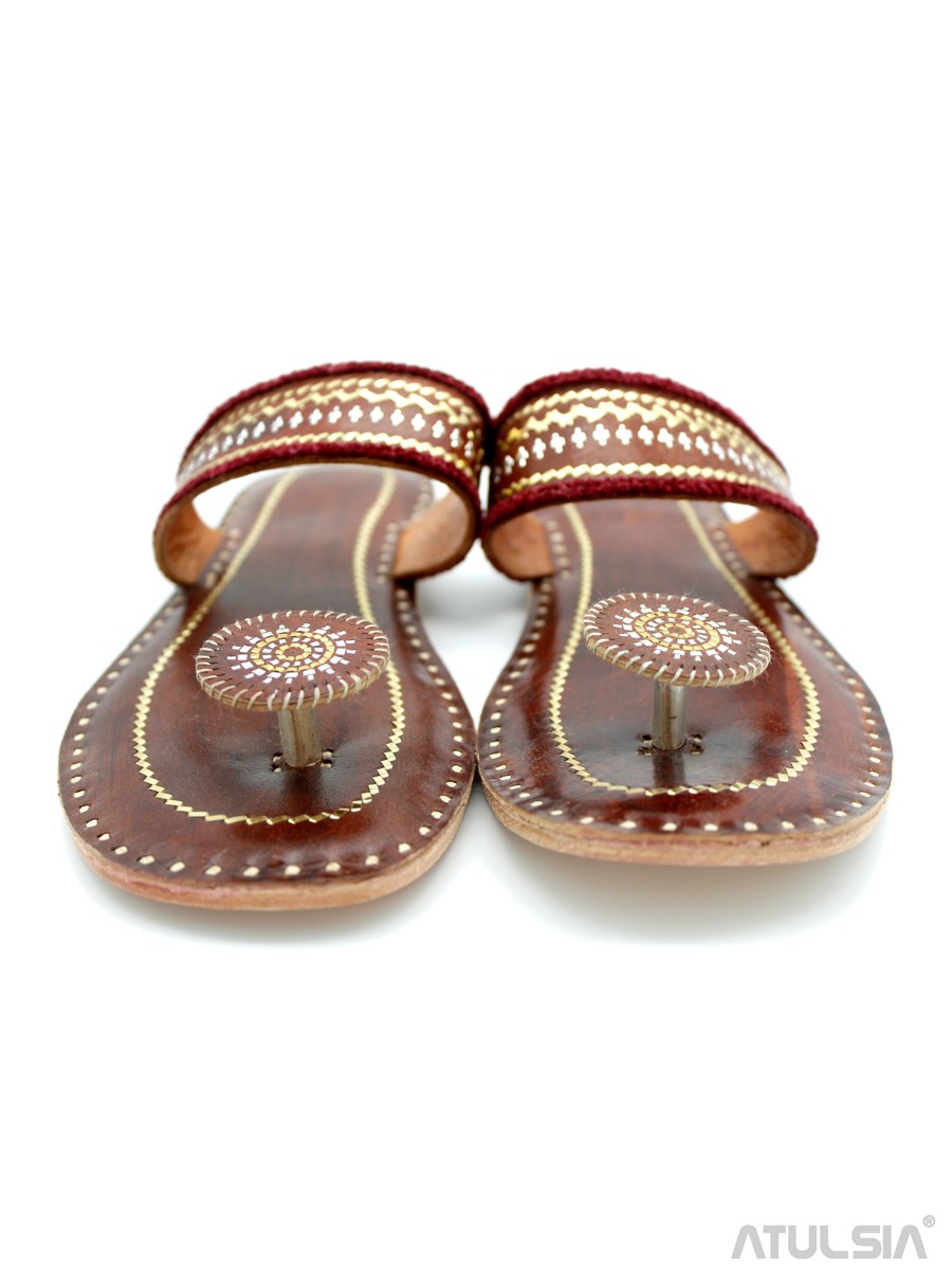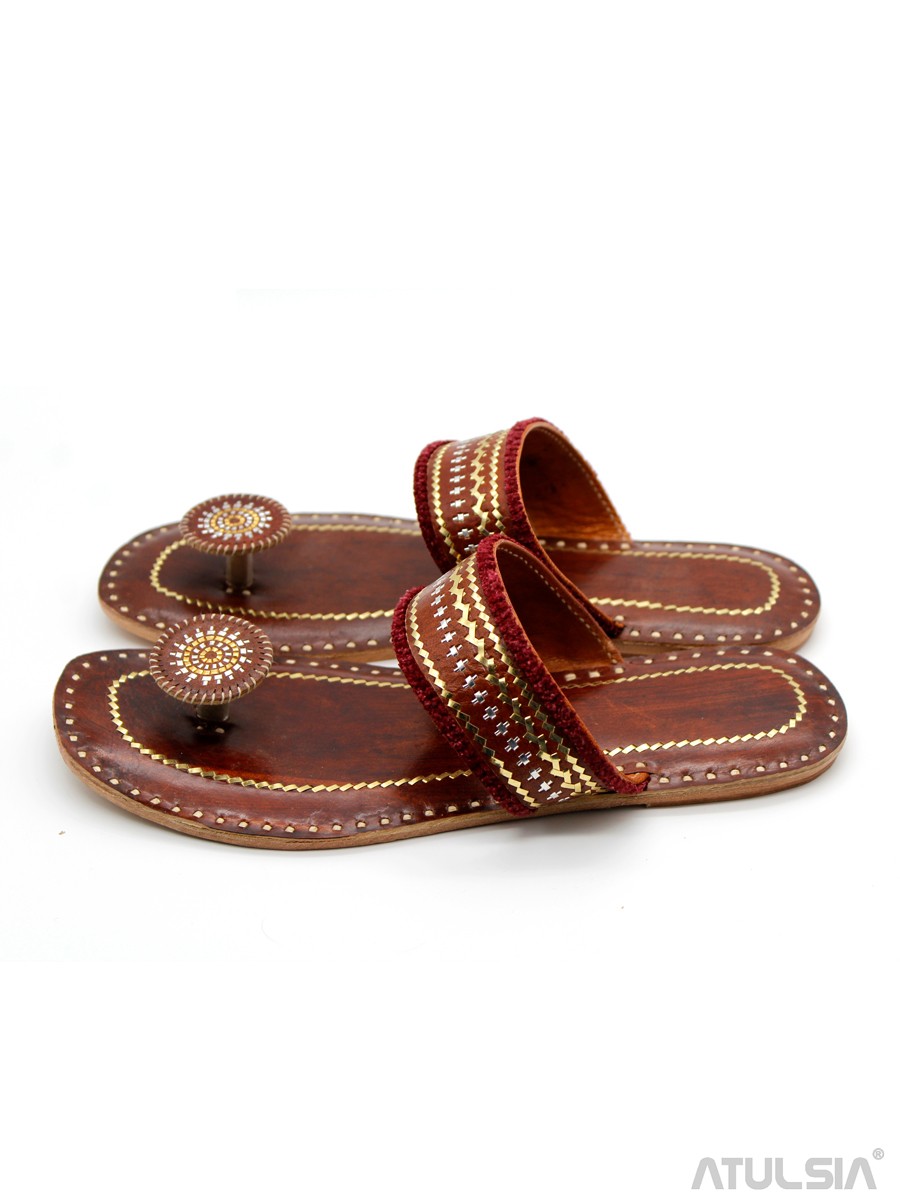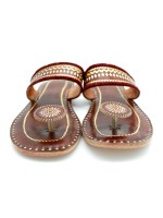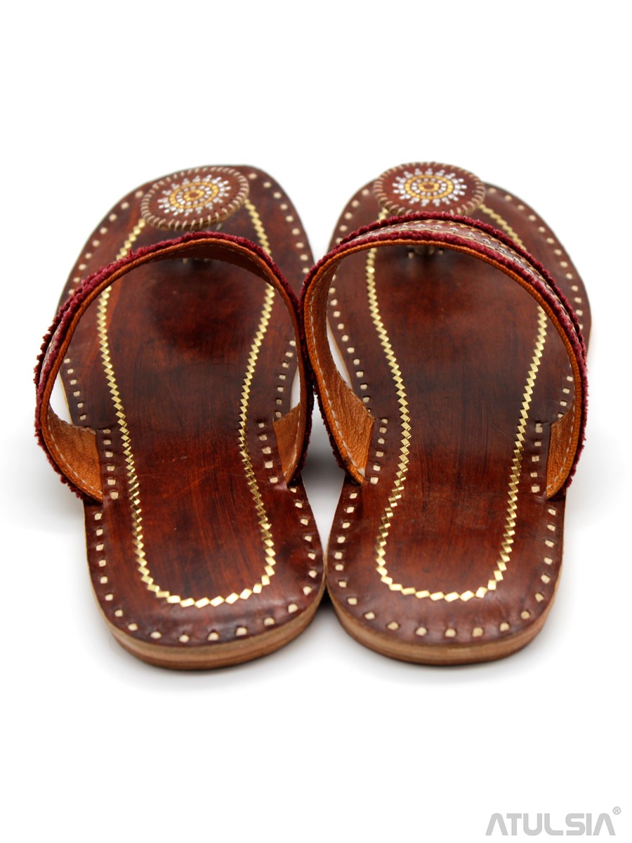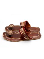 Hand embroidered brown leather jary tikli slippers for women for festive and casual wear.