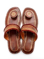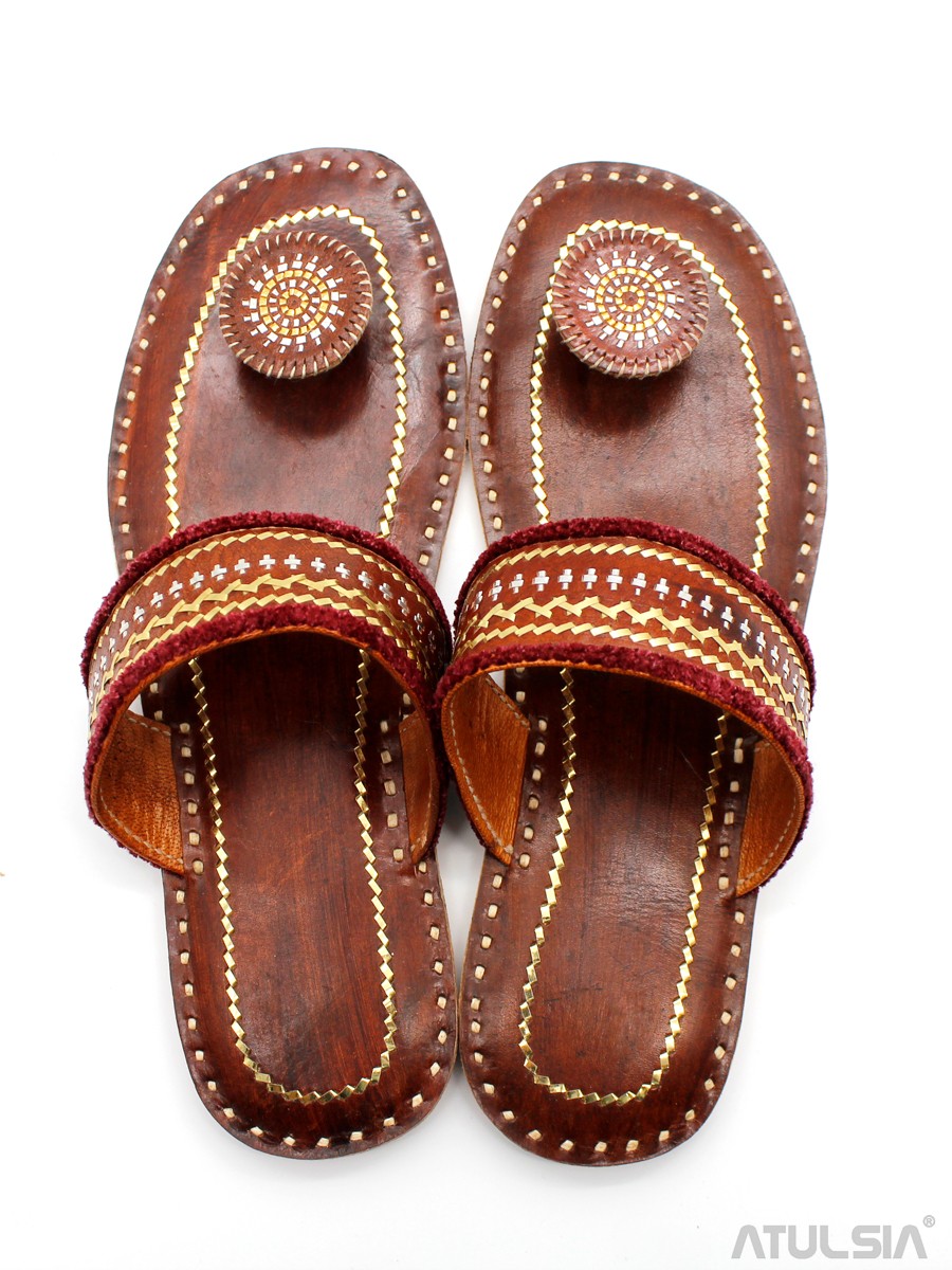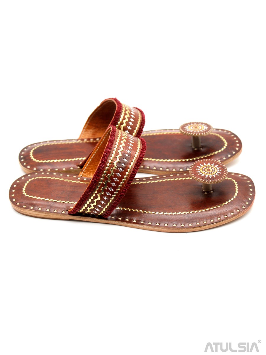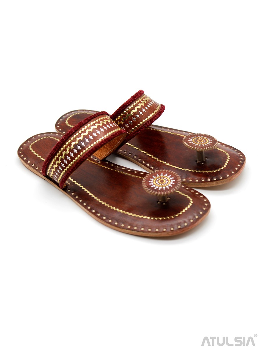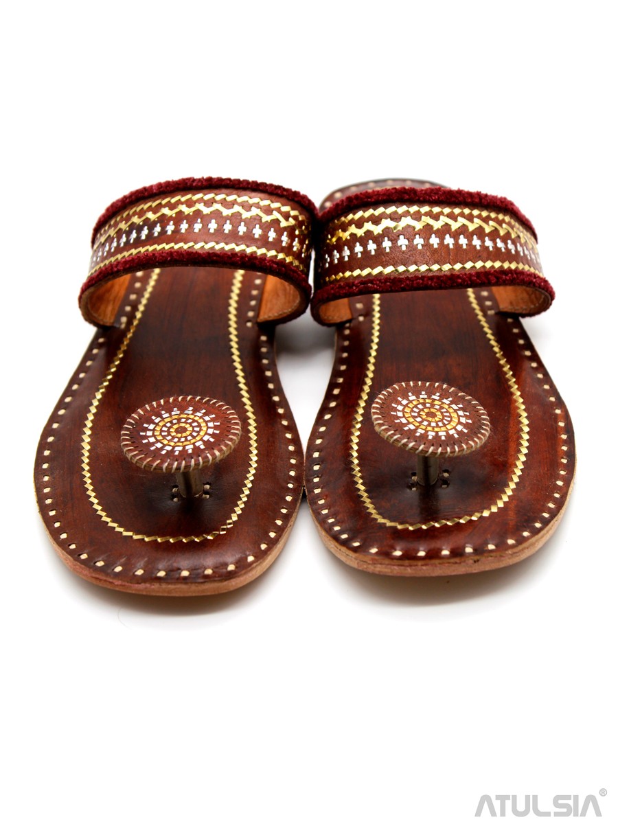 Hand embroidered brown leather jary tikli slippers for women for festive and casual wear.