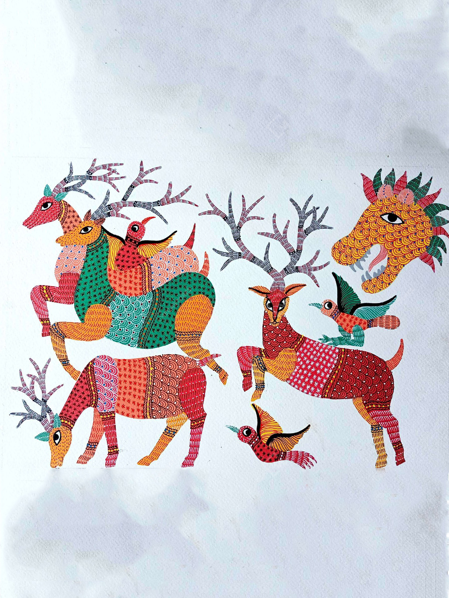 This hand-painted Gond art painting depicts an intricately designed herd of deers. It is a must have piece of wall art to impart ethnic vibes to your home decor.