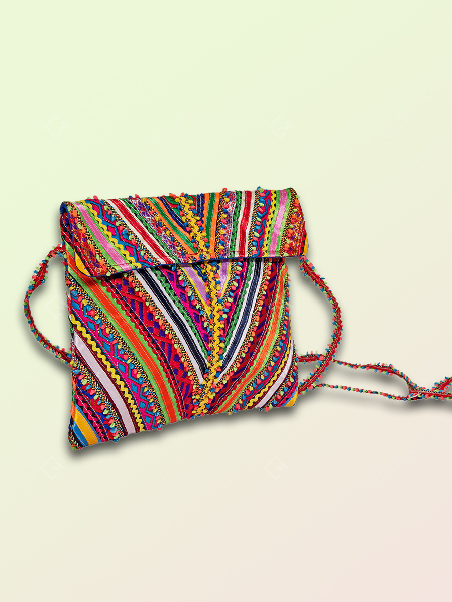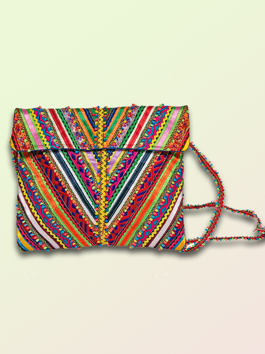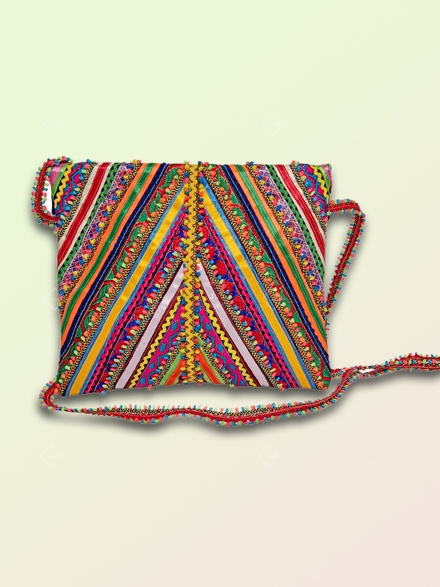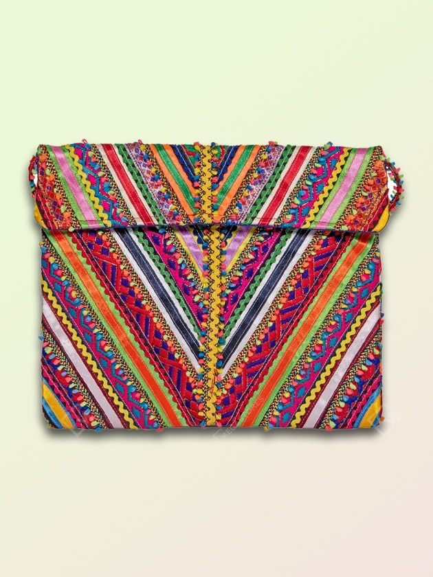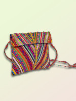 Add ethnic charm to your attire with this multicolor hand embroidered hari jari work Pabi passport bag. This handcrafted bag is ideal to keep passport and important documents, having one compartment with two magnetic snap closure. It is a must have piece of fashion accessory to add earthy vibes to your festive wear.