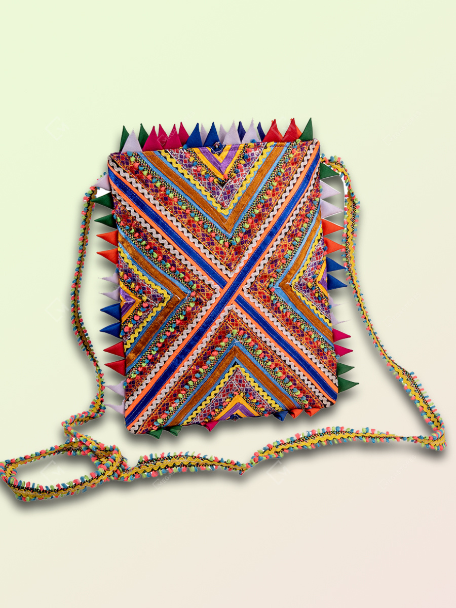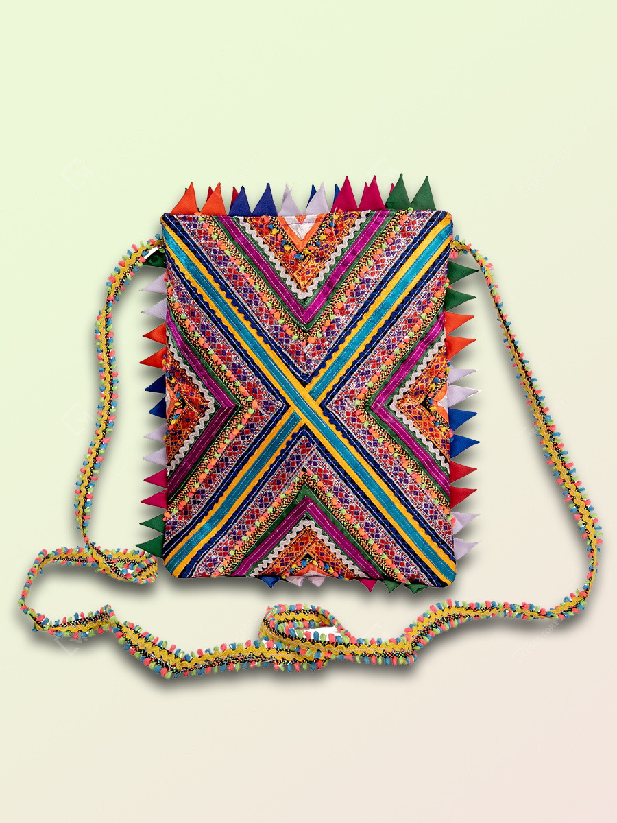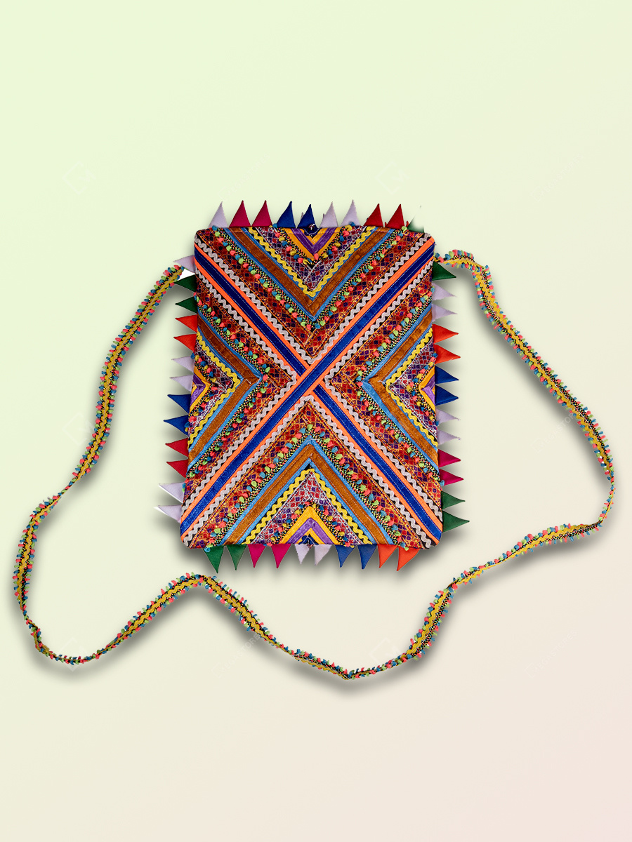 Add ethnic charm to your attire with this multicolor hand embroidered hari jari work Pabi sling bag. This handcrafted bag is ideal to keep mobile, chasma, keys or wallets, having one main compartment with zipper closure. It is a must have piece of fashion accessory to add earthy vibes to your festive wear.