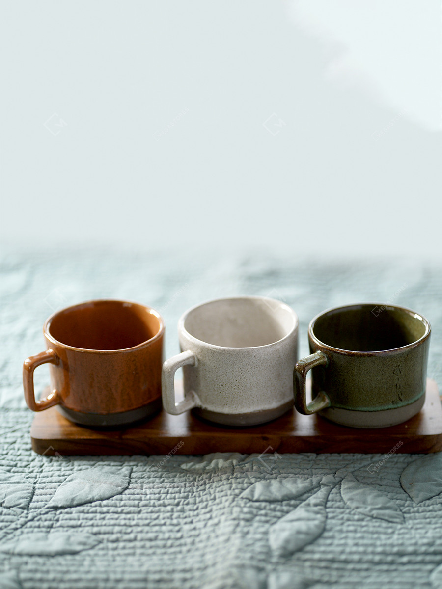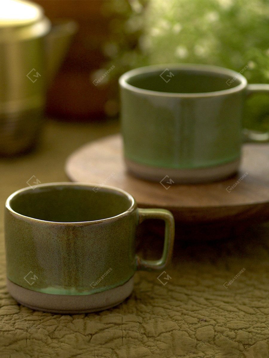 Bhor Ceramic Set of 2 Pista Coffee Mug is hand cast with love and artistry. The two-tone finish juxtaposes the glazed green colored surface with natural earthy grey of the ceramic. The classic timeless simplicity of medieval pottery reflects through reactive glazes making each piece unique and exclusive.