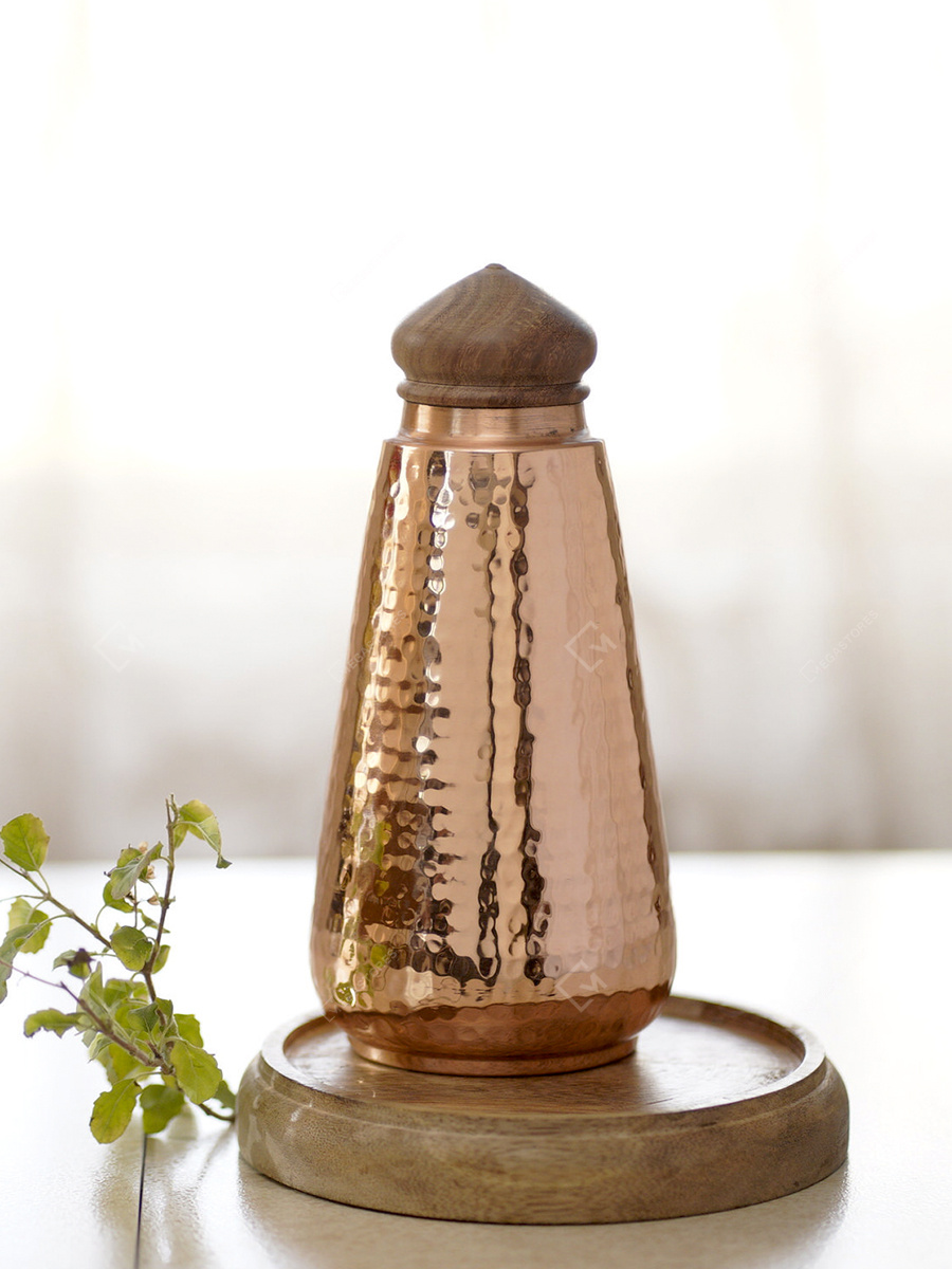 Courtyard brings back the same water drinking ritual back in contemporary homes Jaltarang Copper Bottlle With Wooden Knob. Made from pure copper, the Jaltarang Copper Bottle, induces the healing properties of the water when stored overnight. Fine shimmering hammering on the copper surface with a dome shaped Sheesham knob, this compact size bottle makes it an excellent gift for family and professional friends.