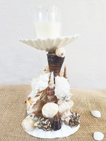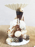 A decorative sea shell candle holder from Goa. A striking candle holder is handcrafted with multiple types and colors of shells handpicked from Goa. The asymmetrical structure of the candle holder is created paying attention to details. Each shell is carefully pieced together, resulting in a beautiful piece to light any room in your home.