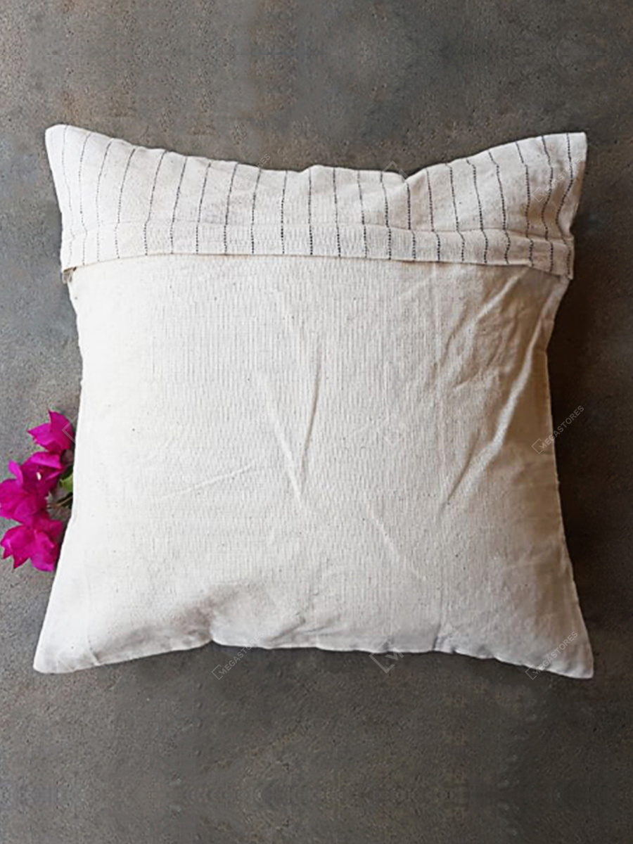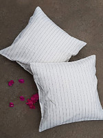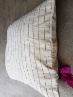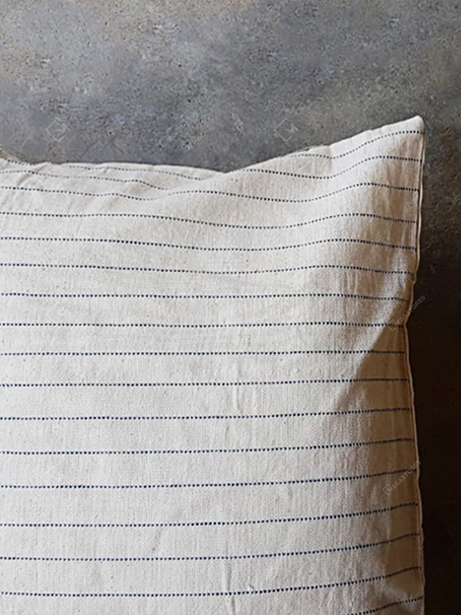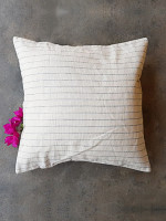 A traditionally handwoven 100% organic cotton pillow cover from Kutch, Gujarat. A contemporary pillow cover, handwoven and sewn by the artisans of Gujarat. The entire piece consists of parallel, dotted stripes. It is simple in design and is a perfect addition to a basic overview of a room.