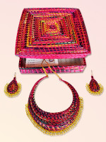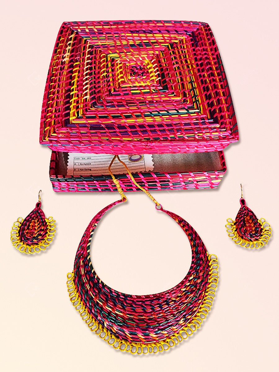 This elegant multicolor necklace set is handcrafted by the craftswomen of Bihar. Natively sourced sikki grass is processed further, it is dried, dyed, and then handwoven to deliver these masterpieces. These sustainable and eco-friendly handmade pieces of jewelry made out of sikki grass are traditionally worn in marriages and cultural events by local women.